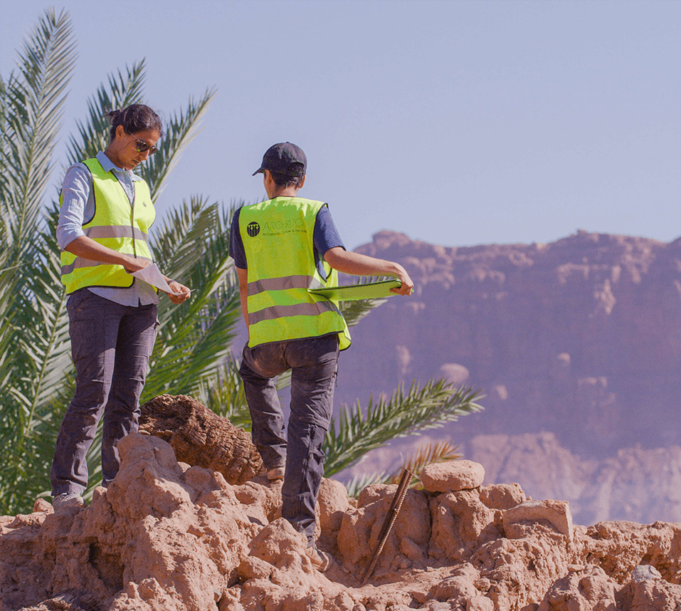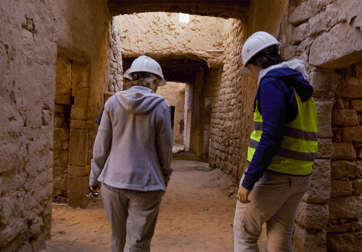 We can find the researchers of the MuDUD project, lead by Apolline Vernet, helmets tightly fastened, tending to AlUla’s old town, an inextricable and sublime tangle of cubic mud-brick houses, abandoned in the early 1980s. Inseparable from the oasis, this ghost city, silent witness to a multi-secular know-how and way of life, is also the subject of a historical study. Data coming from stratigraphy and building archaeology, together with CRAterre’s expertise on raw earth architecture, are already informing the thoughts of the urban planners and architects responsible for the oasis’s development.