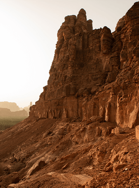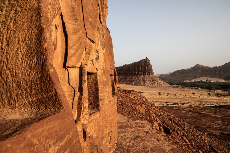Red sandstone canyons and basalt plateaus, a deep green oasis surrounded by golden sand and strange rocks that look as if they've fallen from the moon, planted like sentinels in the vastness of the desert: AlUla, a valley of wonders carved like a piece of land art deep in the heart of the Hijaz mountains, can be found in the northwest of the Arabian Peninsula. Inscriptions engraved in sandstone, intriguing petroglyphs, monumental troglodyte tombs, medieval fortresses, and places of worship punctuate this immense territory where the sheer density of relics is staggering. A foray into the valley thus becomes a journey through time as you follow in the footsteps of the Bronze Age ostrich hunters, the camel caravans along the ancient incense trade route, and the medieval pilgrims on the road from Damascus to Mecca.