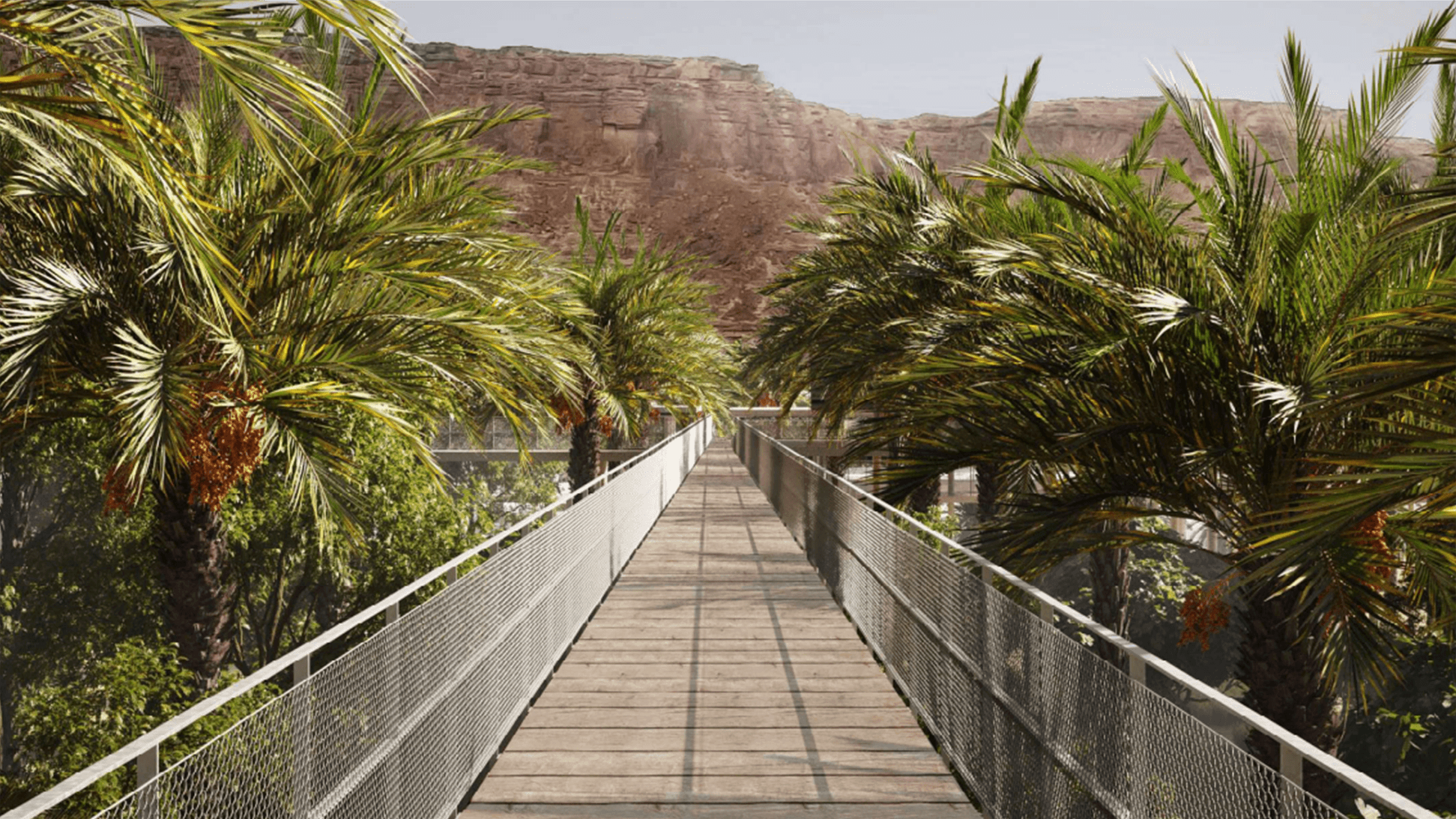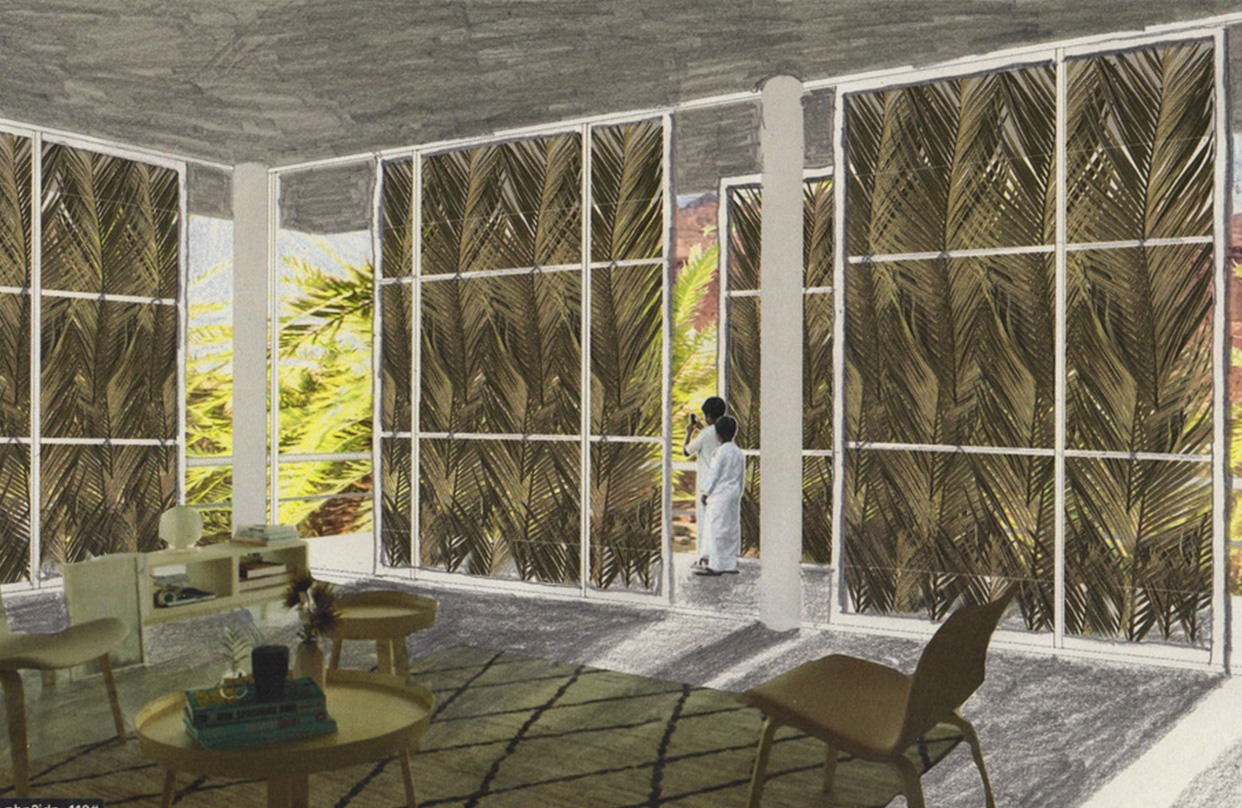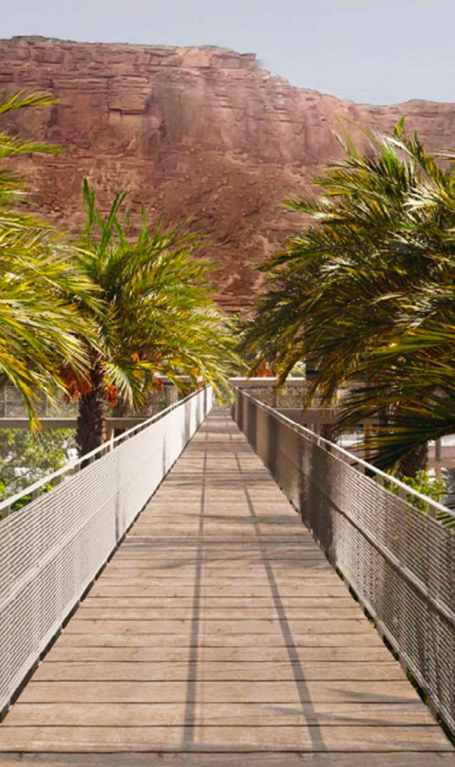 Our proposal is to free up the ground over practically the entire area in order to guarantee free movement. There will be two layers: one on the surface, which will be open-plan and will connect the city and the oasis, and one above, with the various activities. The construction will be quite dense on the urban side and the closer we go towards the oasis the less dense and more dispersed it will be, without overly impacting the ground level, so preserving the natural elements and agriculture. We imagined a floating infrastructure 6 meters above the denser parts of the city and 7/8 meters high towards the palm groves. Similar to an observatory, it will be possible to move across the site and see what is happening below. The shape of the wadi will be reworked, while preserving it as a natural space, so that it remains public and accessible by walkers when it is dried out.