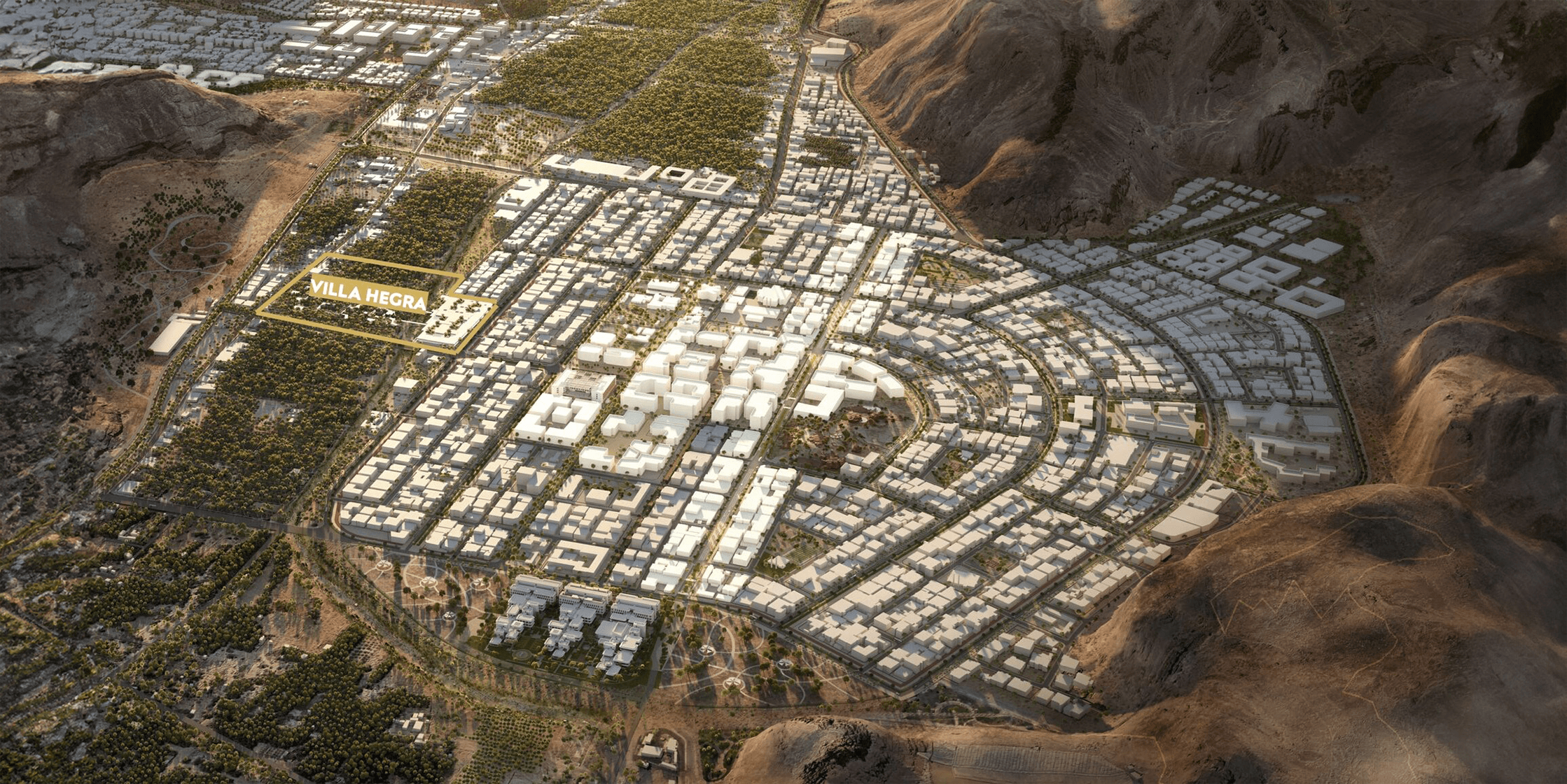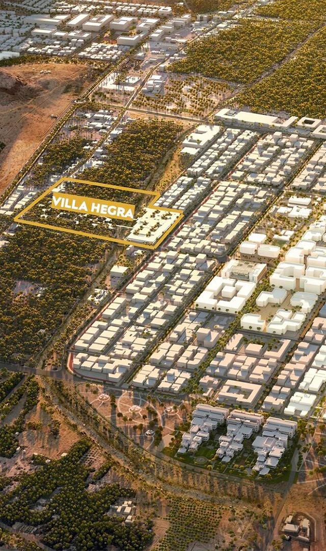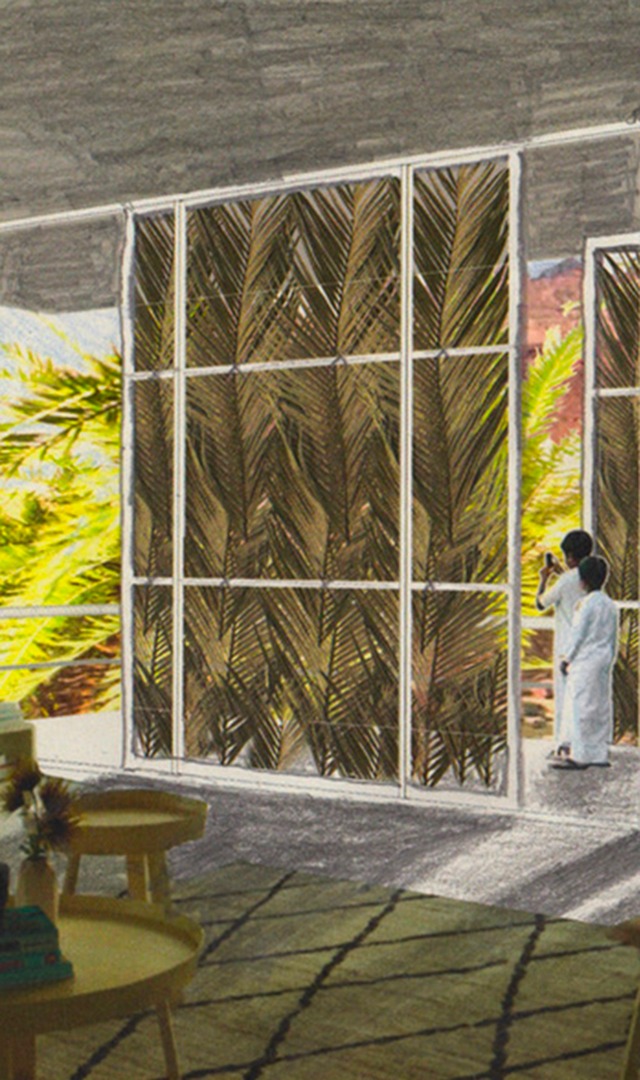 The Old Town of AlUla inspired us. With its very dense winter district and its more spread-out, summer district surrounding the oasis, we are able to perceive something much more contemporary: the remarkable intelligence in the layout of the city with respect to the climate. The way these two districts were built, how they play with geography and climate, immediately spoke to us. The land of the Villa Hegra is also composed of two parts, on each side of the wadi, so we quickly made the connection. This became the main theme of the project: how to work with this density, combining the three programs: the Villa Hegra, with its cultural spaces (amphitheater, library, etc.), the Ferrandi school and the hotel and at the same time ensuring this link with the palm grove.