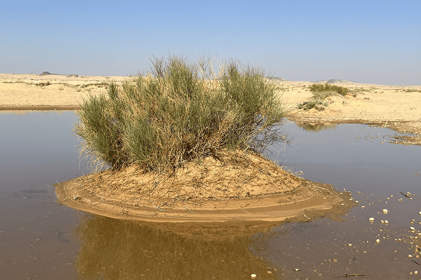 Some shrubs build up mounds that collect water and sediment during rainfall and flash floods.