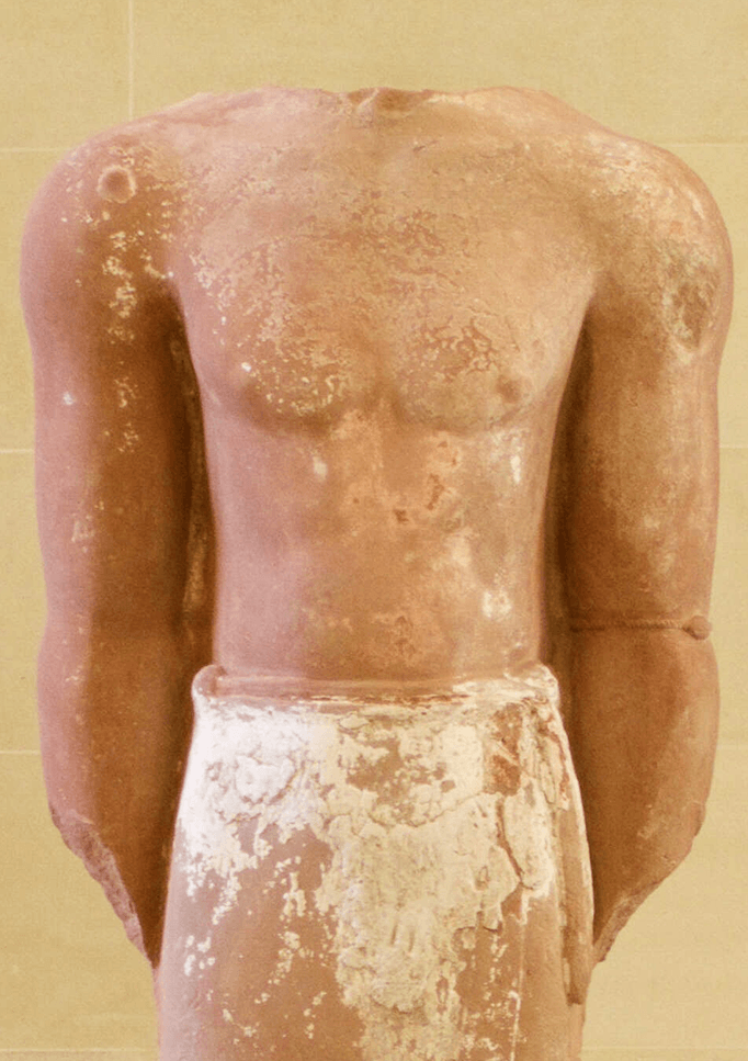 C’est à l’occasion des fouilles archéologiques menées entre 2005 et 2007 par l’Université du Roi Saoud qu’a été découverte, dans le sanctuaire de Dadan, une immense statue de grès, datée entre le Ve et le IIIe siècle avant notre ère. On reconnaît une figure masculine, debout dans une pose frontale statique, les bras alignés le long du corps. Bien que lacunaire (la tête est manquante), la sculpture n’en demeure pas moins imposante. Mesurant plus de deux mètres, elle représente vraisemblablement un roi - à moins qu’il ne s’agisse d’un prêtre ou d’un personnage en prière - de l’ancien royaume de Lihyan. Le traitement détaillé des muscles du torse ou encore de l’abdomen témoigne d’un remarquable savoir-faire, caractéristique de la statuaire lihyanite. Son style, éminemment original pour la région, reflète le début de l’influence artistique de l’Égypte, de la Grèce antique ou du Moyen-Orient. Des statues de même facture ont déjà été exposées à Paris dans le cadre de l’exposition AlUla, merveille d’Arabie, organisée en 2019 à l’Institut du monde arabe (IMA).