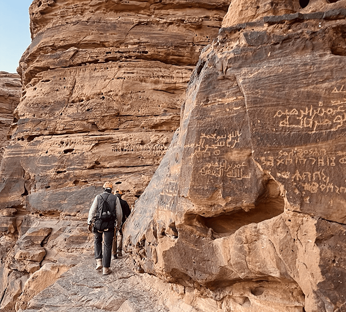 Plus de 440 inscriptions gravées dans plusieurs langues, majoritairement en dadanique, témoignent des rituels qui étaient effectués au sommet à l’occasion de pèlerinages. La découverte la plus marquante reste celle d’un édifice identifié comme le temple de Dhu Ghabat, dont la construction de grande qualité révèle l’importance.
